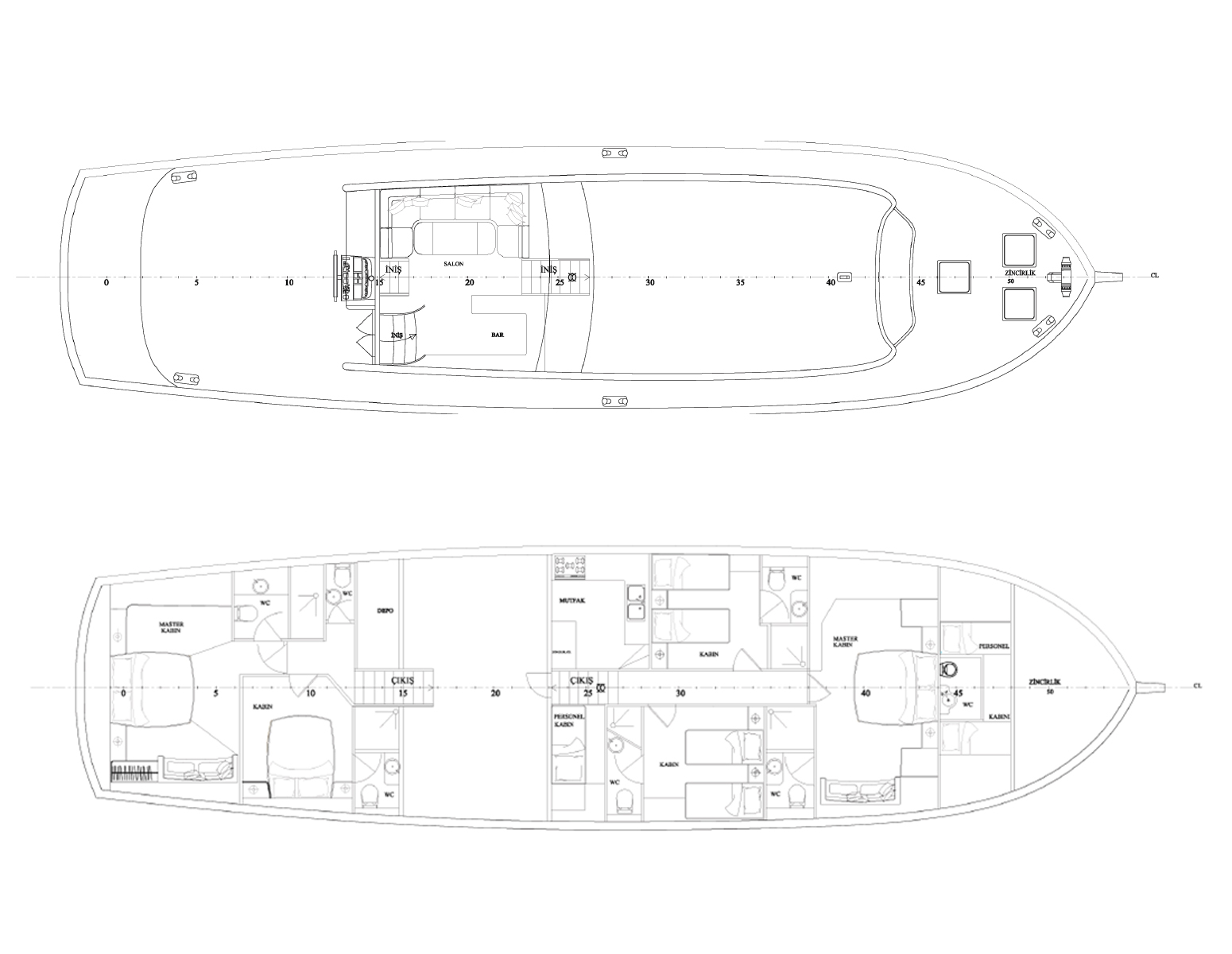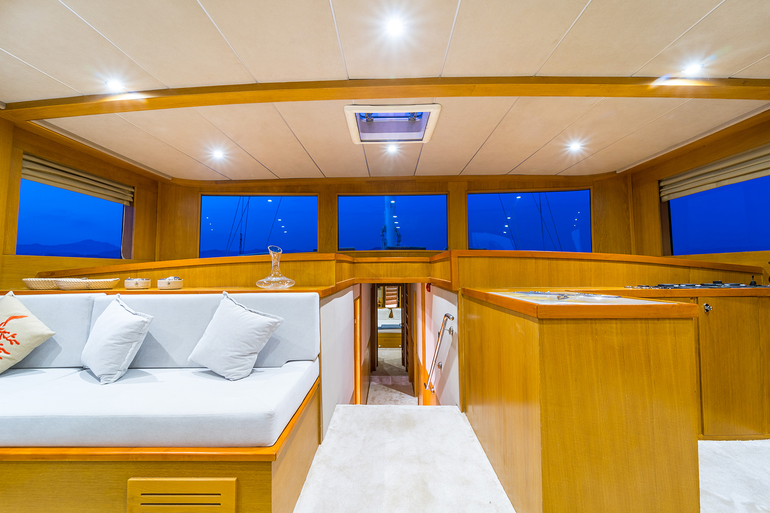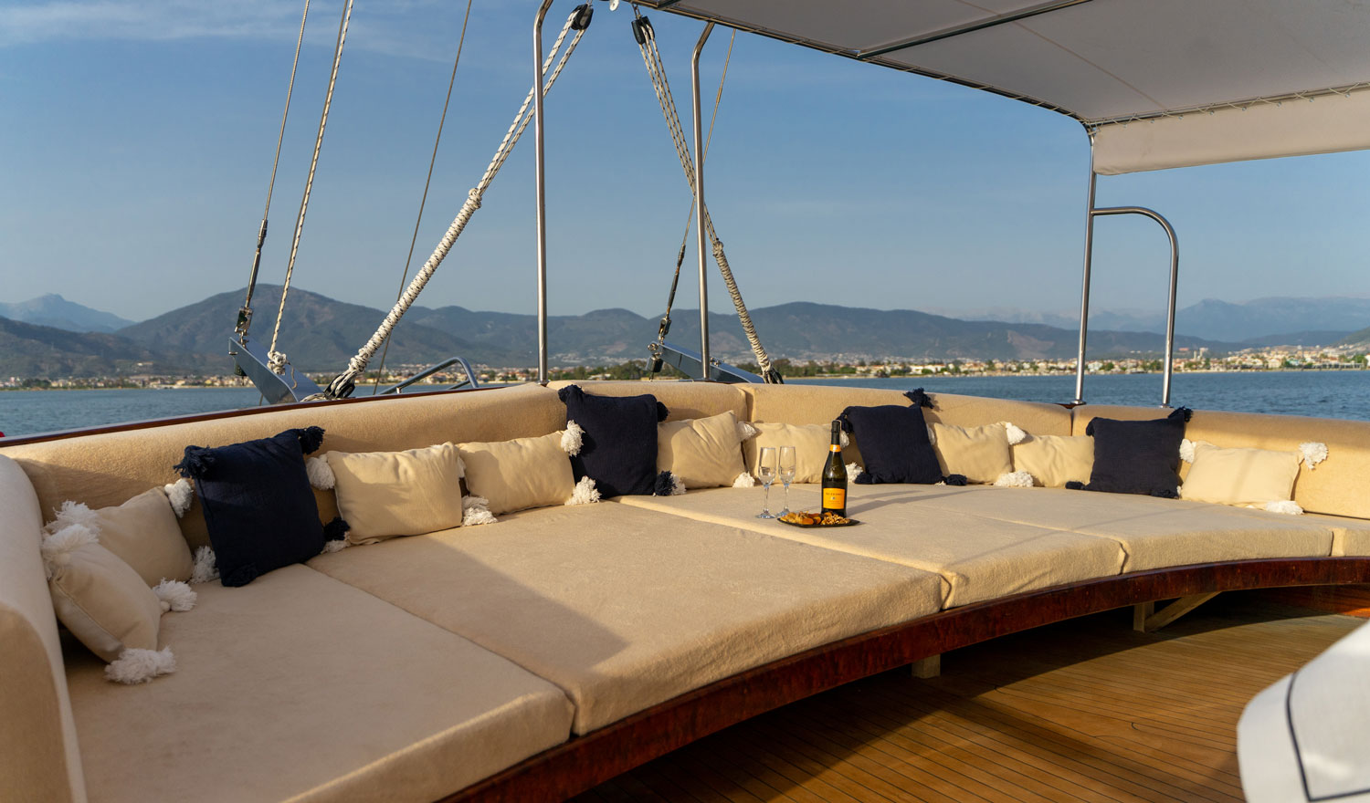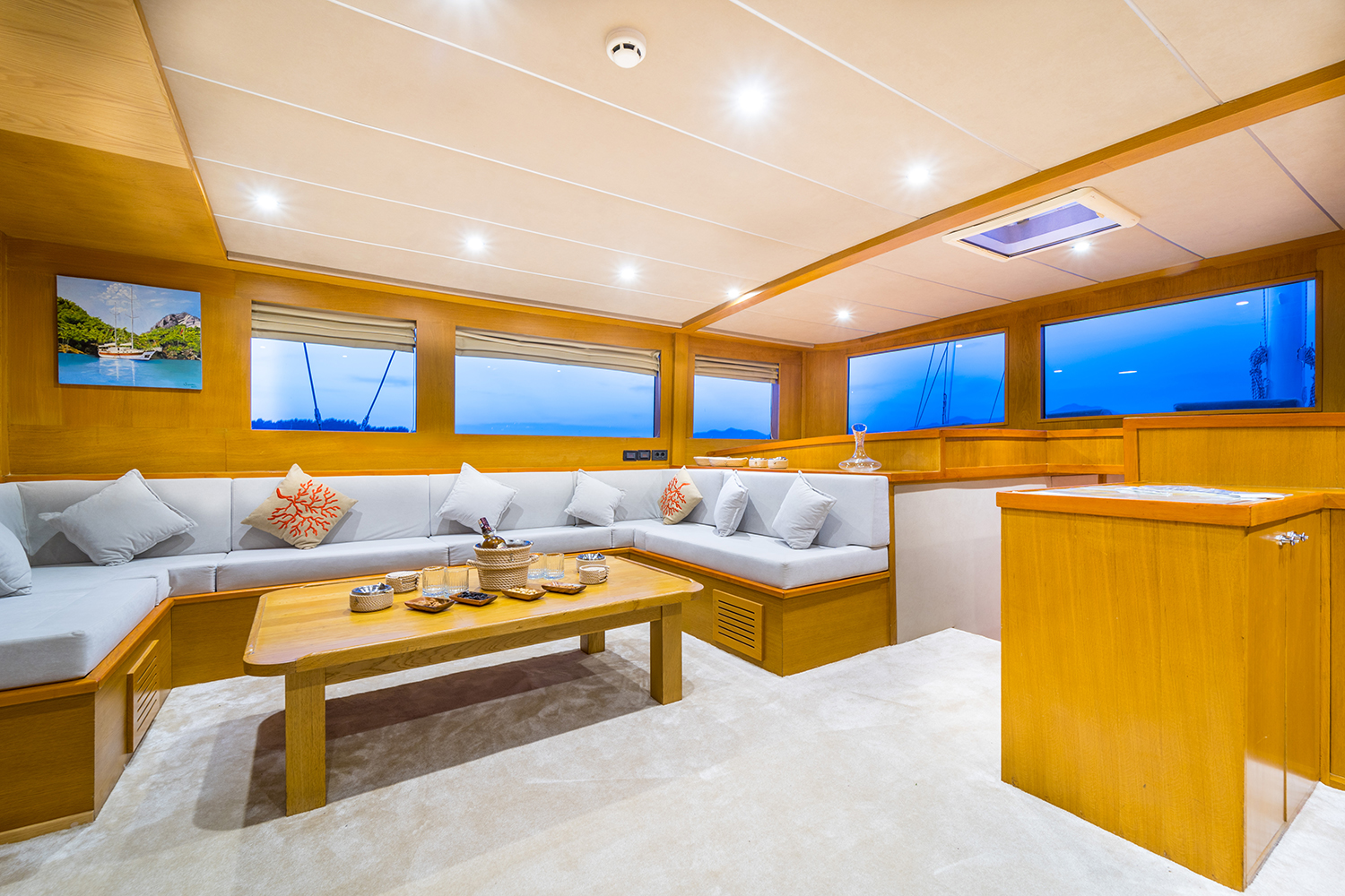 Refitted in 2021, HAPPY DAYS is a spacious motor-sailer with a classic exterior look and modern interior. 10 guests can comfortably be accommodated in 5 cabins which include 2 masters, 1 double and 2 twins. The aft master with its’ panoramic sea view is particularly romantic. All cabins are en-suite and with 24 hour air-conditioning. The aft deck hosts full beam wide lounging cushions, a dining table that can easily seat 10 guests and a fully stocked bar for speedy service. A soft top cover that can be folded down to deck level offers protection from wind and sun when required. On the forward deck there is ample space with sunbathing mattresses for all guests and a seating area with two sunset cocktail tables. HAPPY DAYS comes with a 6.80m tender with a 200hp outboard engine, far more powerful compared to other vessels of her size, allowing for fantastic water sport experience. A professional crew of 5 are onboard to offer service with famous Turkish hospitality for an unforgettable vacation.